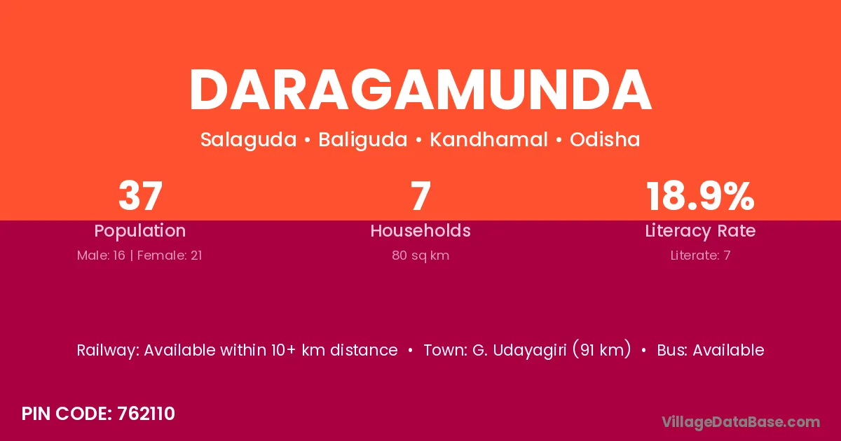 Daragamunda village has a total population of 37 people, of which 16 are males and 21 are females.