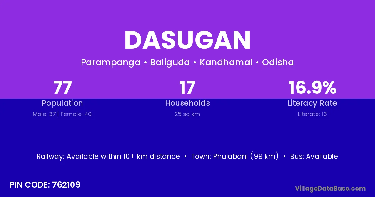 Phulabani (99 km) is the nearest town to Dasugan village for major economic activities and is located approximately 99 km away.