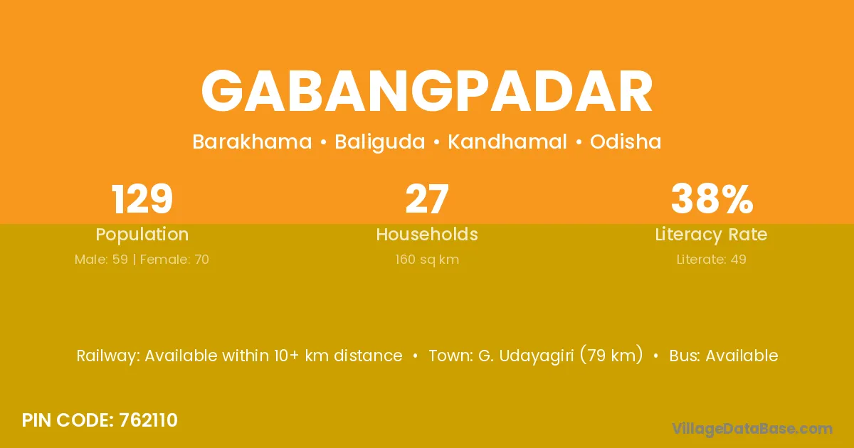 G. Udayagiri (79 km) is the nearest town to Gabangpadar village for major economic activities and is located approximately 79 km away.