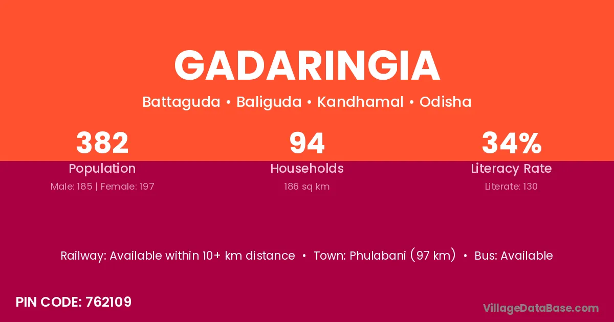 Phulabani (97 km) is the nearest town to Gadaringia village for major economic activities and is located approximately 97 km away.