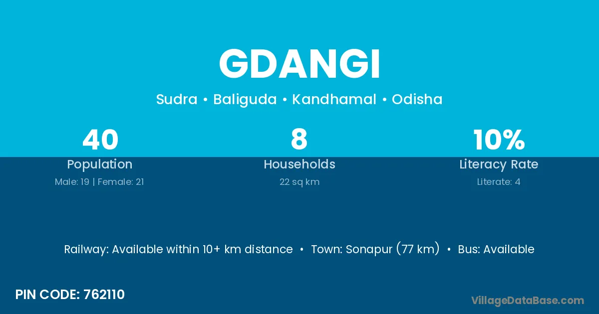 Gdangi village has a total population of 40 people, of which 19 are males and 21 are females.