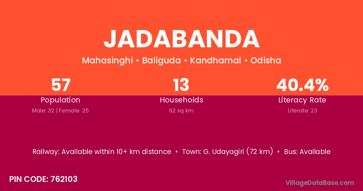 Jadabanda village has a total population of 57 people, of which 32 are males and 25 are females.