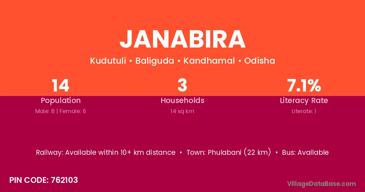 Phulabani (22 km) is the nearest town to Janabira village for major economic activities and is located approximately 22 km away.
