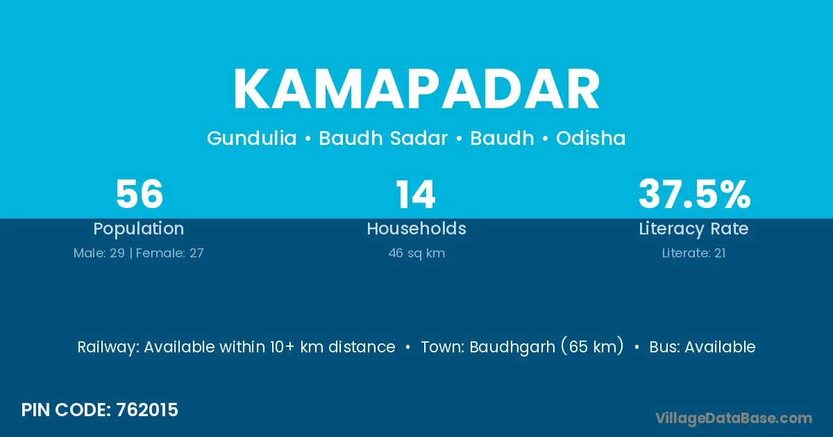The literacy rate of Kamapadar village is 15.79%. Male literacy stands at 32.00% and female literacy at 3.13%.