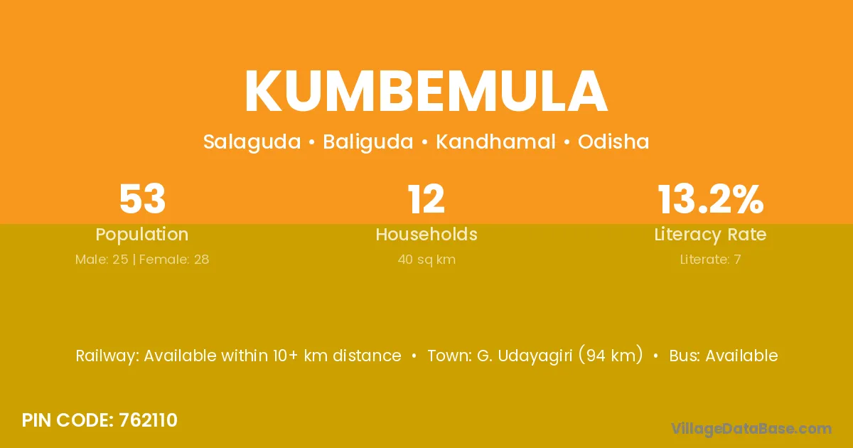 Kumbemula village has a total population of 53 people, of which 25 are males and 28 are females.