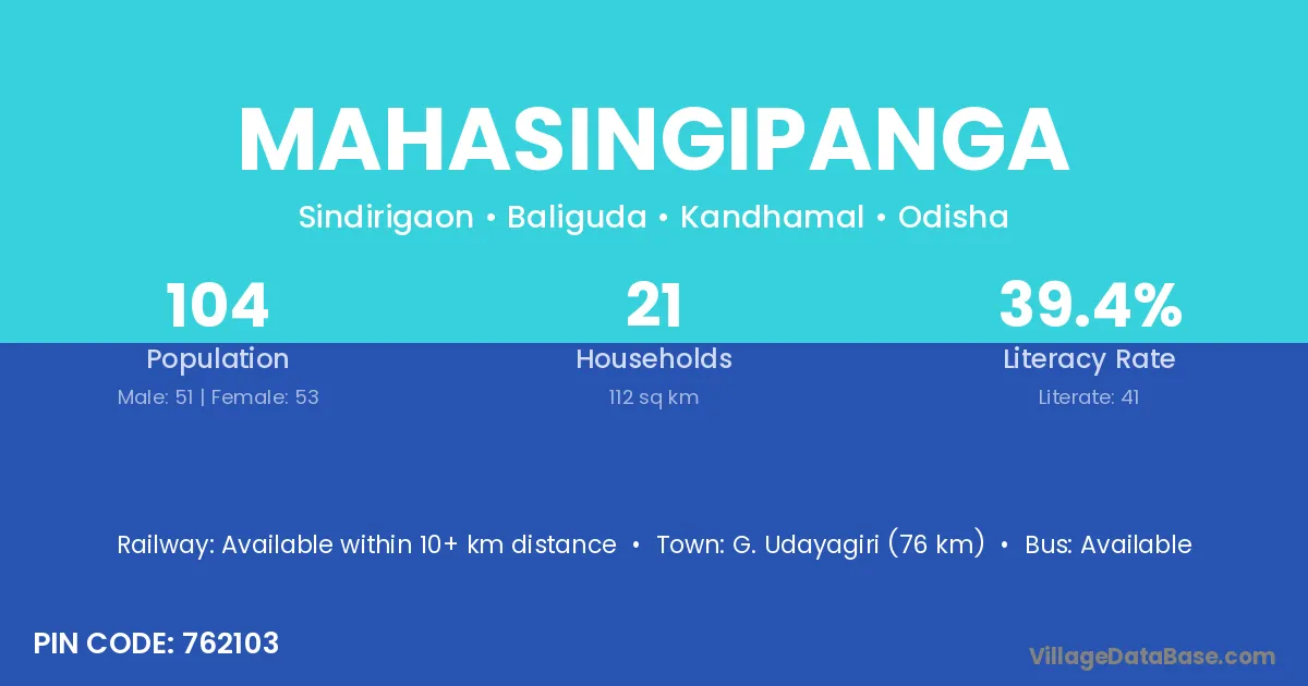 Mahasingipanga village has a total population of 104 people, of which 51 are males and 53 are females.