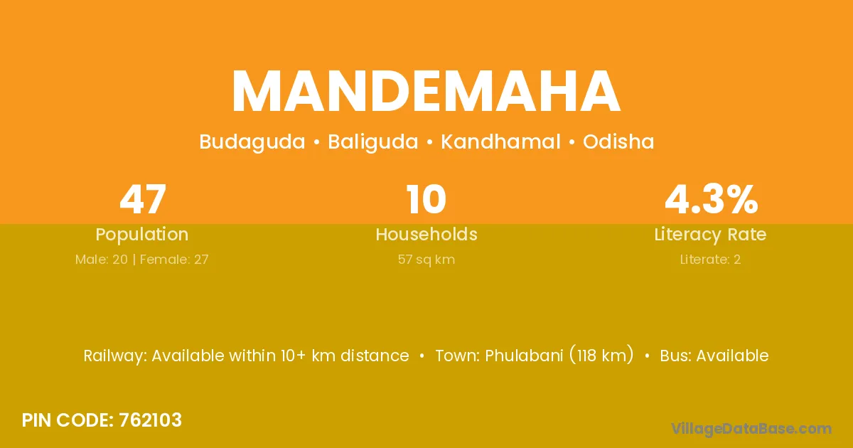 Phulabani (118 km) is the nearest town to Mandemaha village for major economic activities and is located approximately 118 km away.
