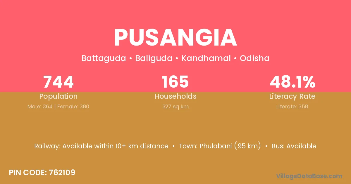 Phulabani (95 km) is the nearest town to Pusangia village for major economic activities and is located approximately 95 km away.