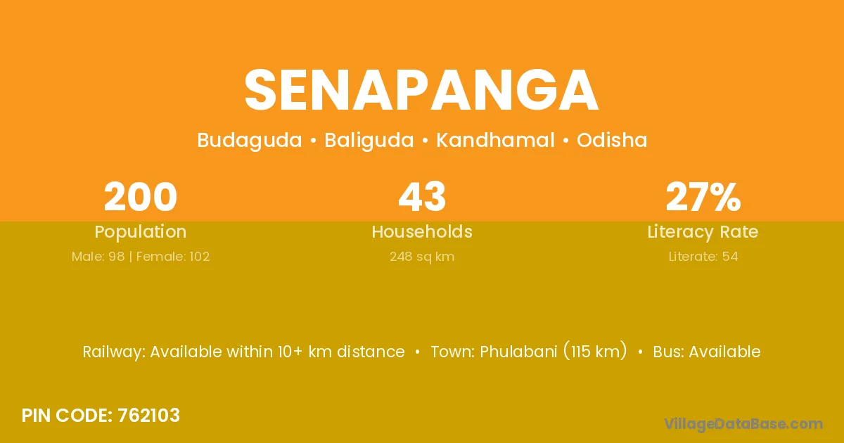 Phulabani (115 km) is the nearest town to Senapanga village for major economic activities and is located approximately 115 km away.