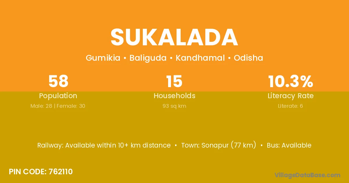 Sukalada village has a total population of 58 people, of which 28 are males and 30 are females.