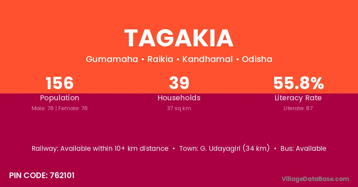 G. Udayagiri (87 km) is the nearest town to Tagakia village for major economic activities and is located approximately 87 km away.