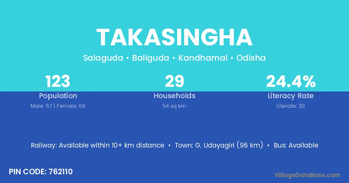 Takasingha village has a total population of 123 people, of which 57 are males and 66 are females.