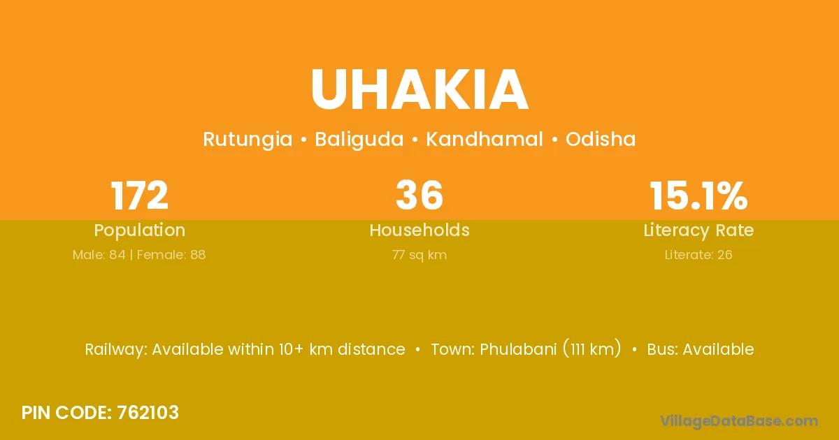 Phulabani (111 km) is the nearest town to Uhakia village for major economic activities and is located approximately 111 km away.