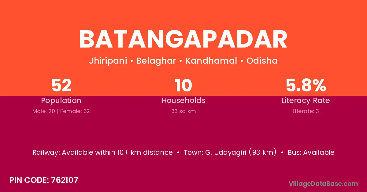 G. Udayagiri (93 km) is the nearest town to Batangapadar village for major economic activities and is located approximately 93 km away.