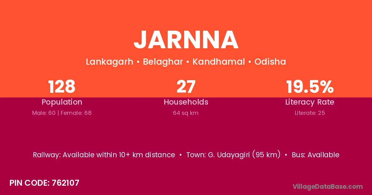 Jarnna village has a total population of 128 people, of which 60 are males and 68 are females.