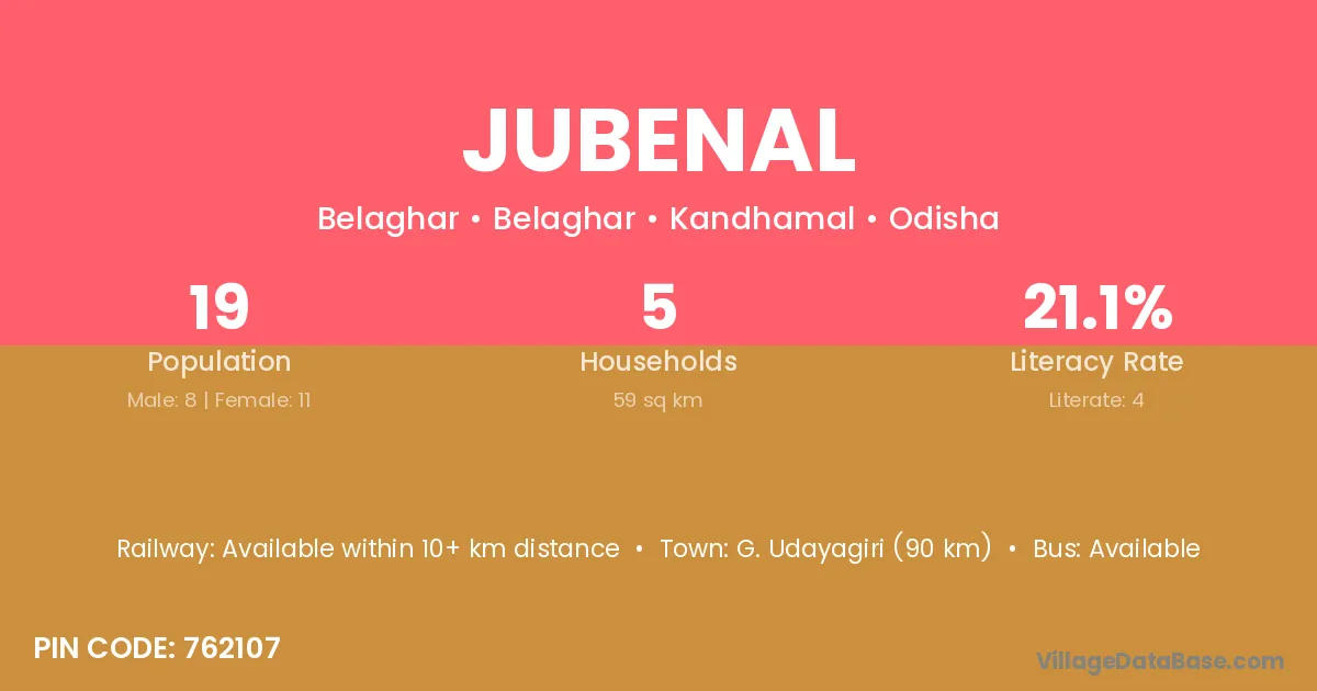 Jubenal village has a total population of 19 people, of which 8 are males and 11 are females.