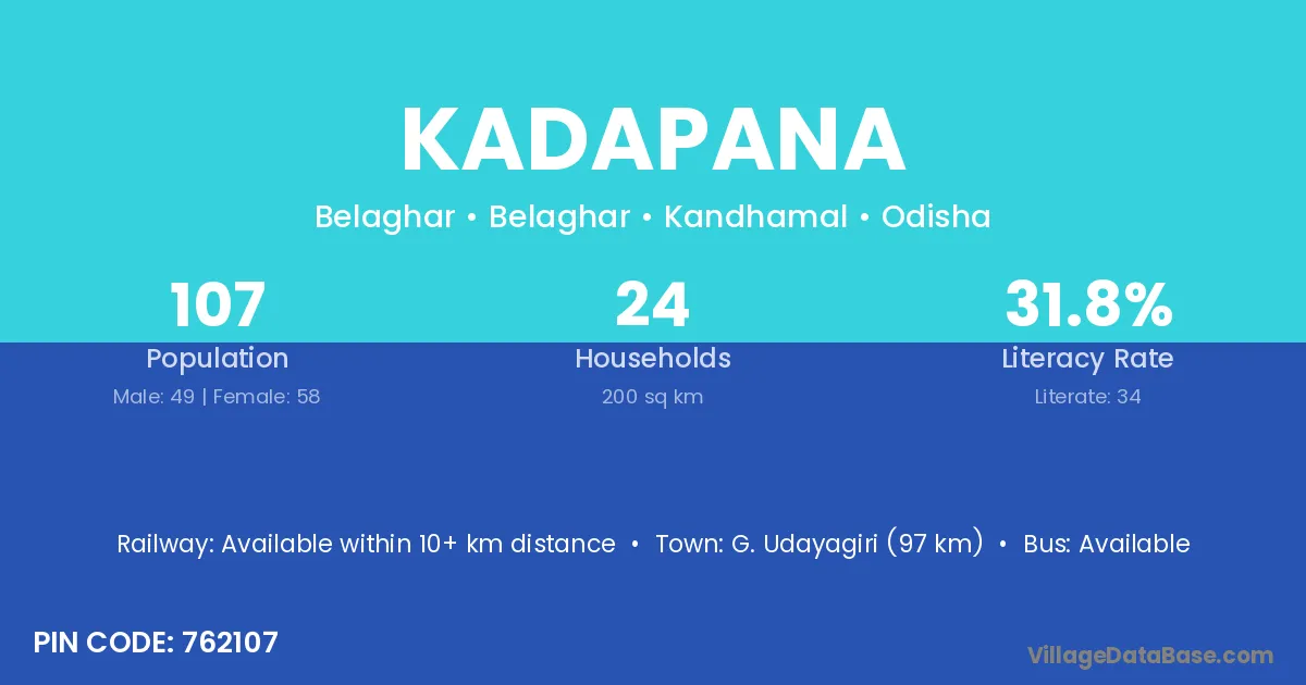 G. Udayagiri (97 km) is the nearest town to Kadapana village for major economic activities and is located approximately 97 km away.