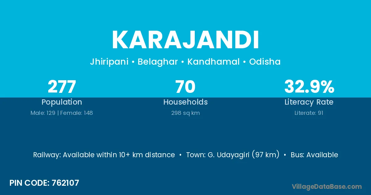 G. Udayagiri (97 km) is the nearest town to Karajandi village for major economic activities and is located approximately 97 km away.