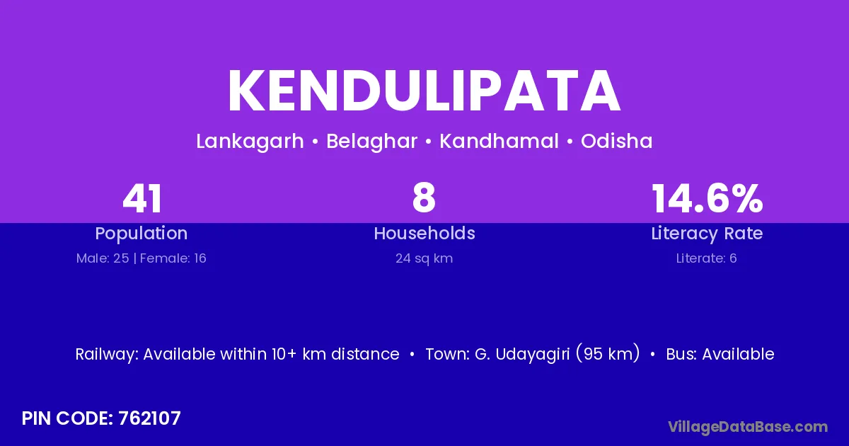 Kendulipata village has a total population of 41 people, of which 25 are males and 16 are females.