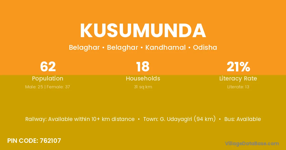 Kusumunda village has a total population of 62 people, of which 25 are males and 37 are females.