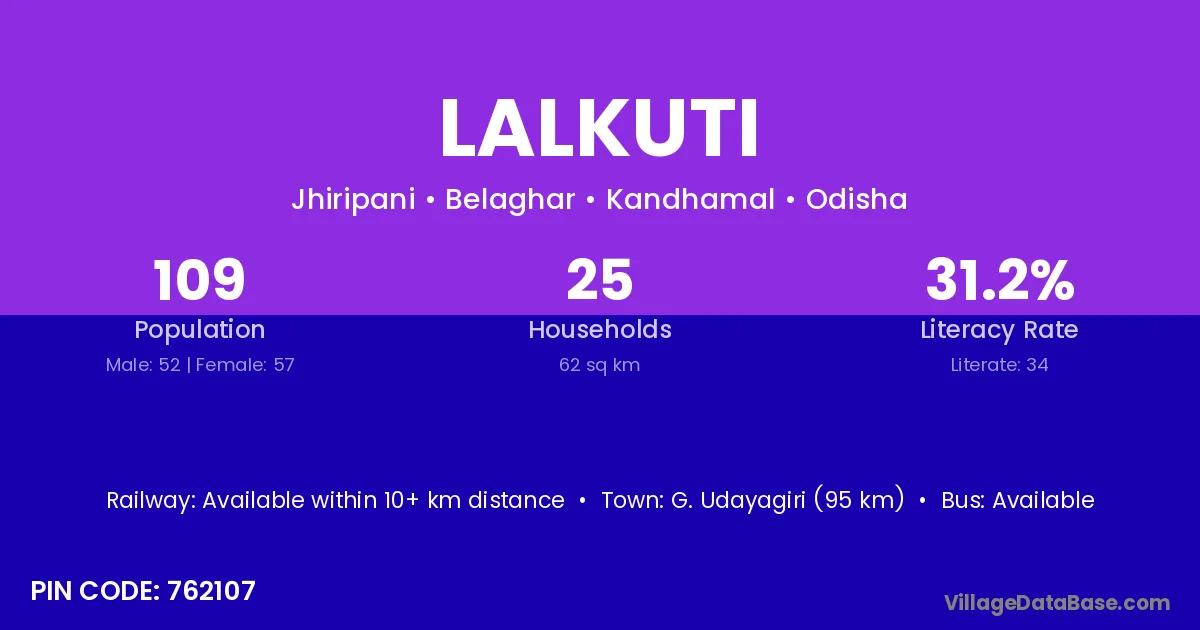 G. Udayagiri (95 km) is the nearest town to Lalkuti village for major economic activities and is located approximately 95 km away.
