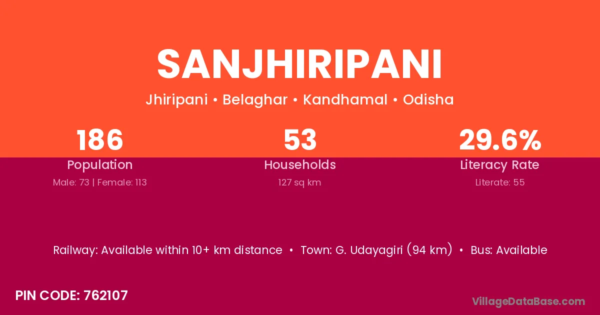 G. Udayagiri (94 km) is the nearest town to Sanjhiripani village for major economic activities and is located approximately 94 km away.