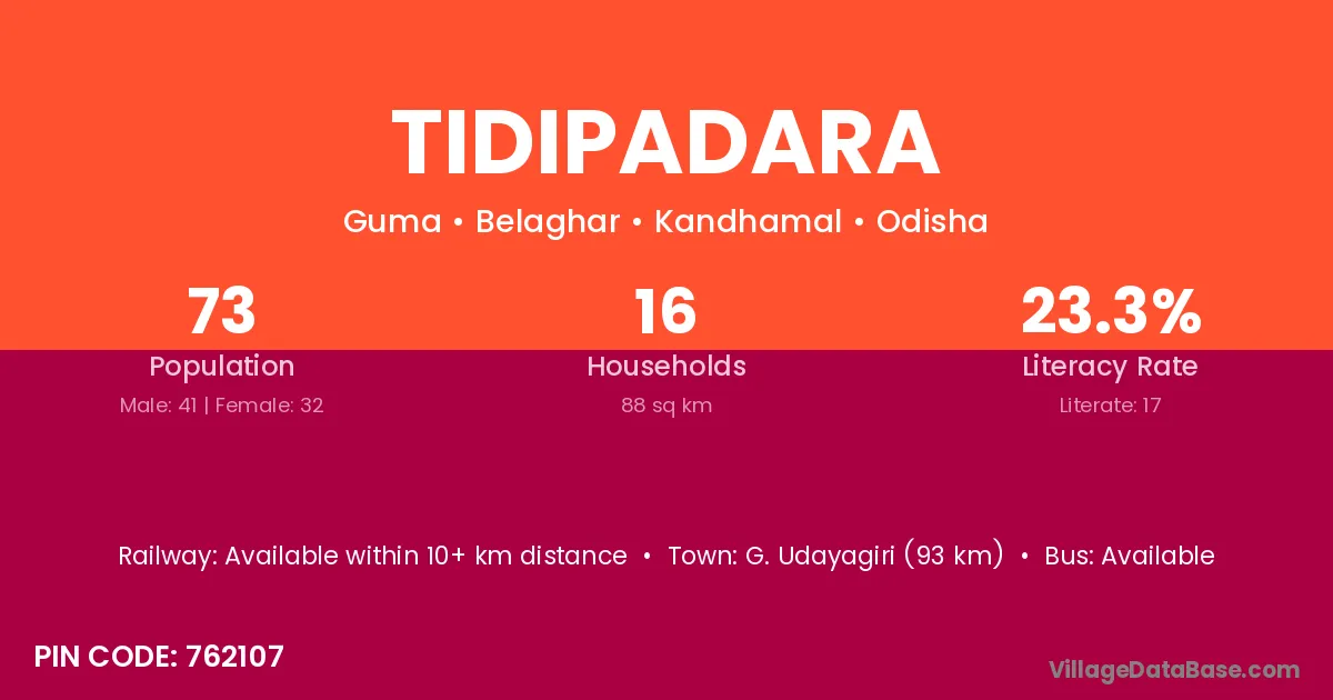 Tidipadara village has a total population of 73 people, of which 41 are males and 32 are females.