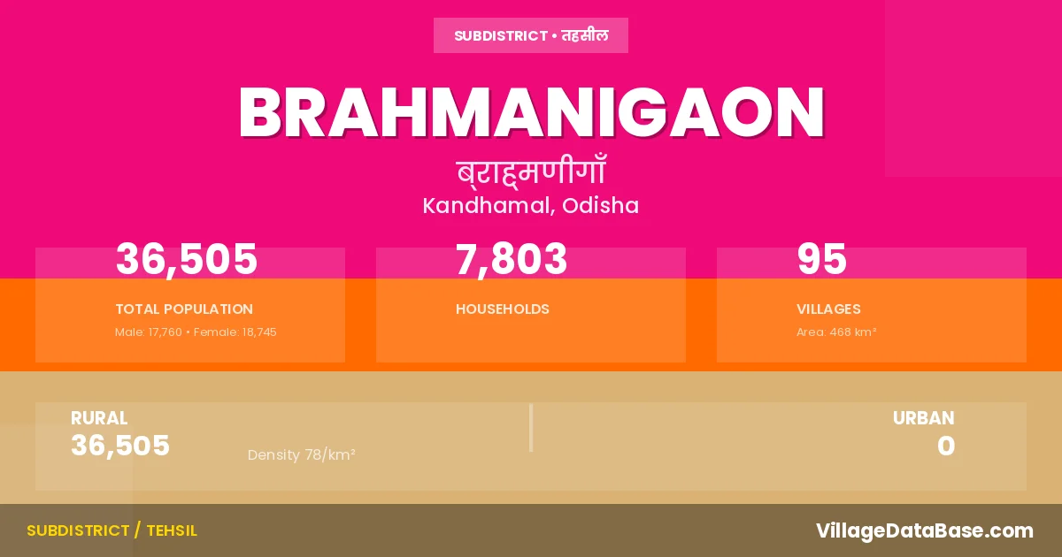 According to the 2011 census The total area of Brahmanigaon Tehsil is 468 km², with a population of 36505 people. The population density is 78 inhabitants per square kilometre, and there are approximately 7803 houses in the sub district.