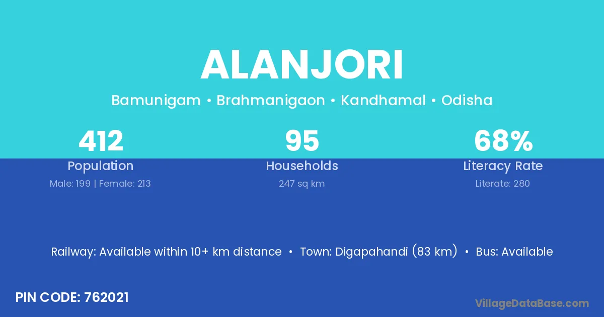 Digapahandi (83 km) is the nearest town to Alanjori village for major economic activities and is located approximately 83 km away.