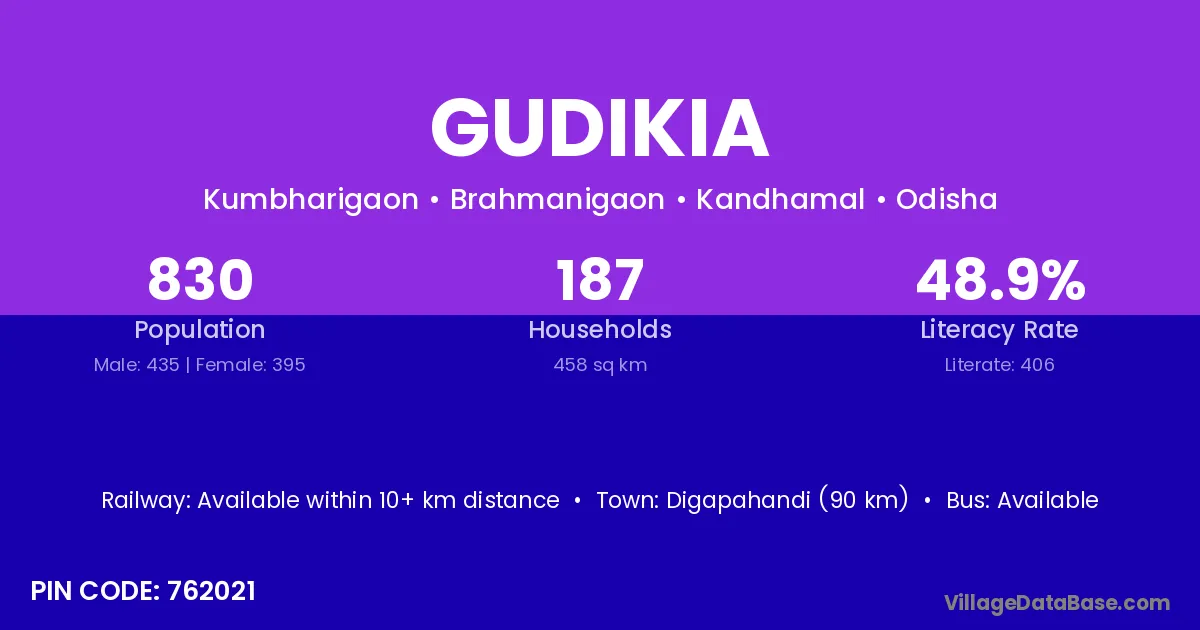 Digapahandi (90 km) is the nearest town to Gudikia village for major economic activities and is located approximately 90 km away.