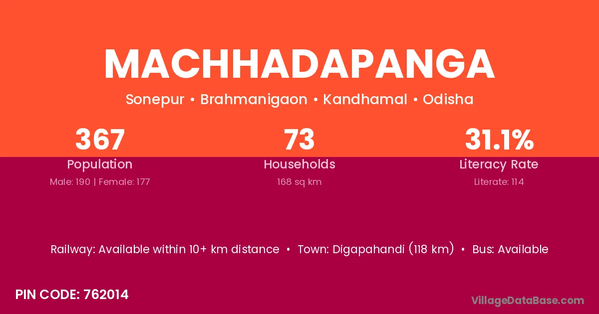 Digapahandi (118 km) is the nearest town to Machhadapanga village for major economic activities and is located approximately 118 km away.