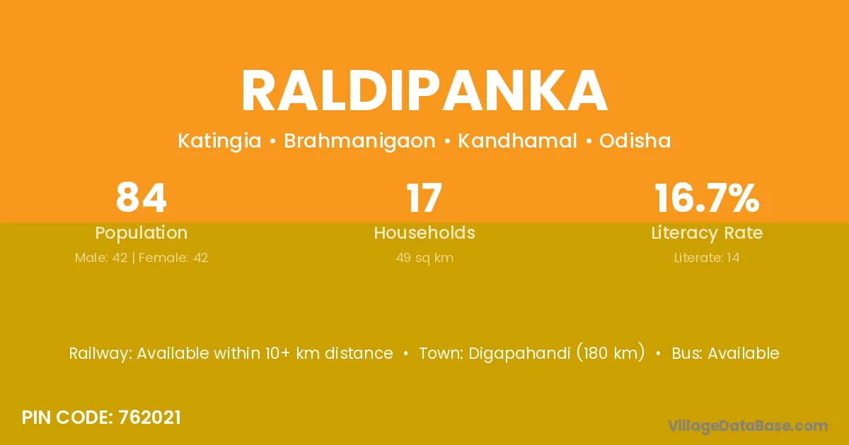 Raldipanka village has a total population of 84 people, of which 42 are males and 42 are females.