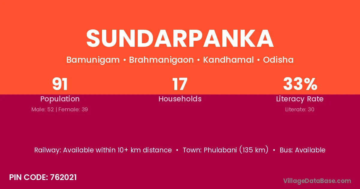 Phulabani (135 km) is the nearest town to Sundarpanka village for major economic activities and is located approximately 135 km away.