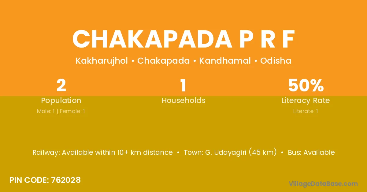 G. Udayagiri (45 km) is the nearest town to Chakapada P R F village for major economic activities and is located approximately 45 km away.