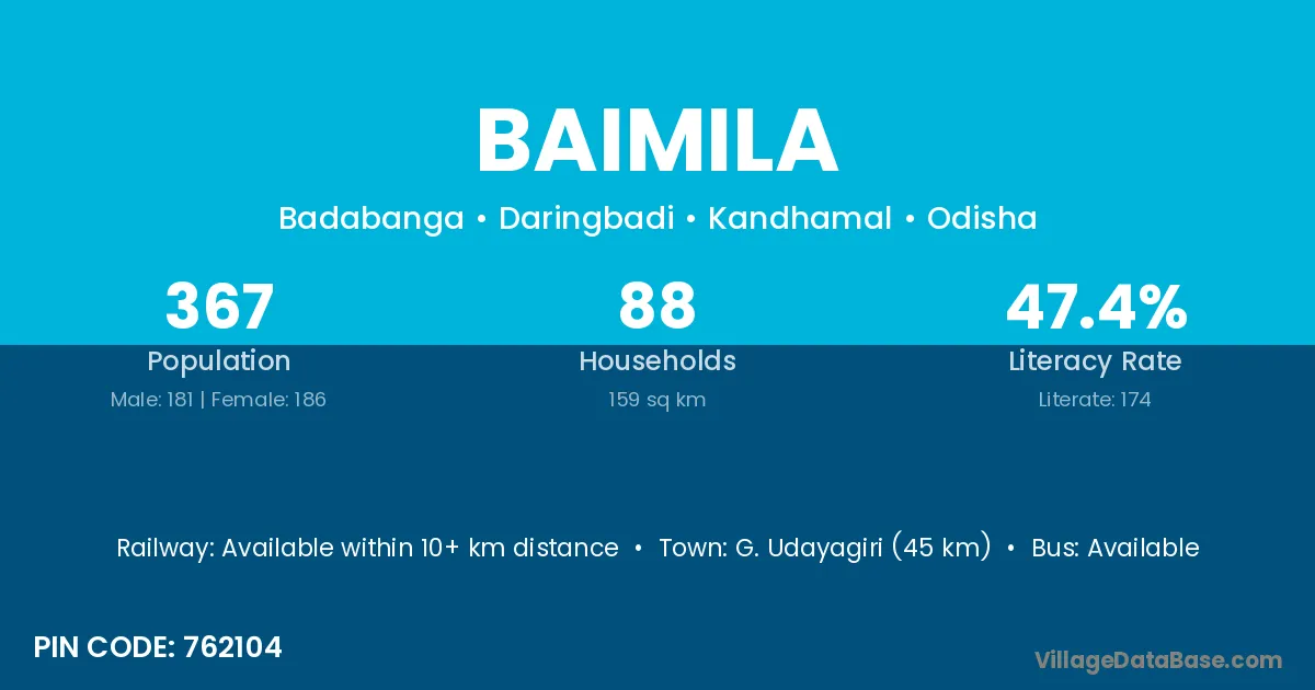 G. Udayagiri (45 km) is the nearest town to Baimila village for major economic activities and is located approximately 45 km away.