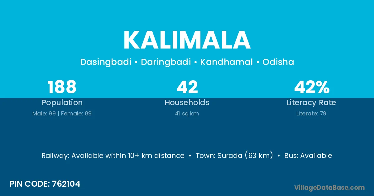 Surada (63 km) is the nearest town to Kalimala village for major economic activities and is located approximately 63 km away.
