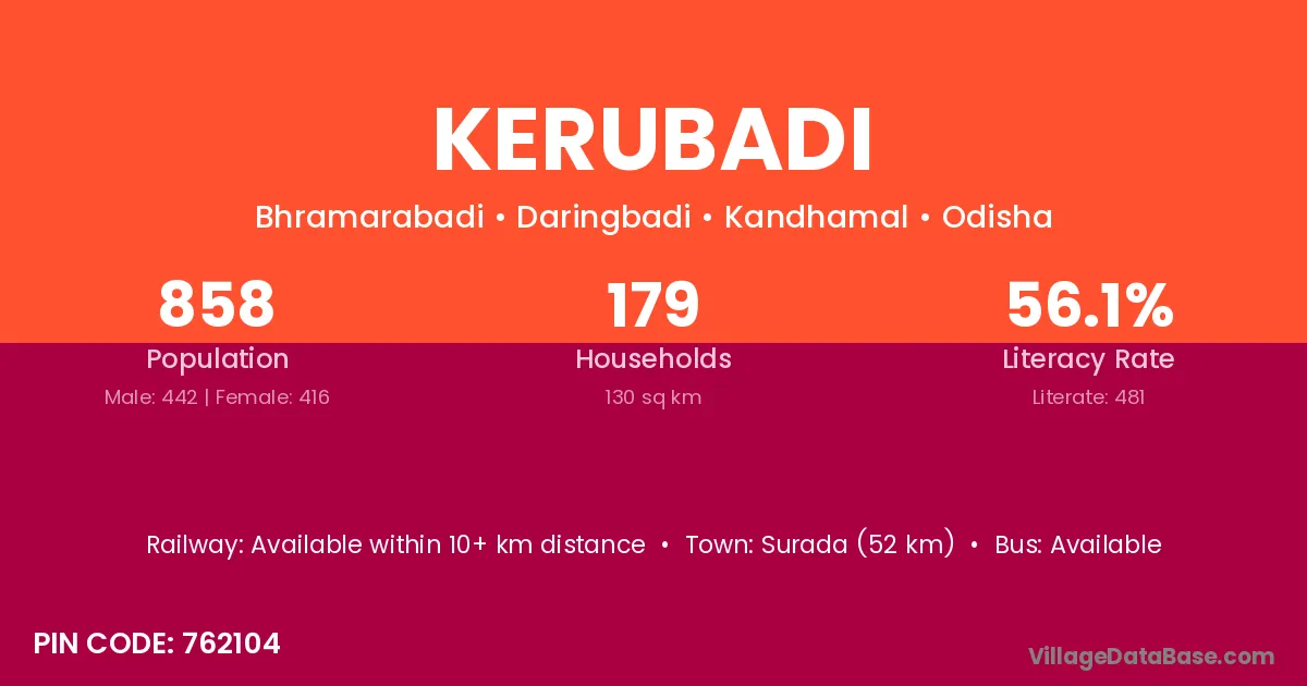 Surada (52 km) is the nearest town to Kerubadi village for major economic activities and is located approximately 52 km away.