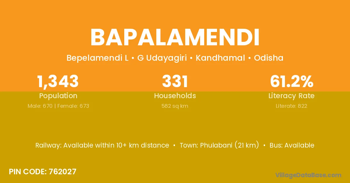 Phulabani (21 km) is the nearest town to Bapalamendi village for major economic activities and is located approximately 21 km away.