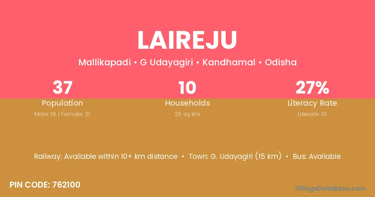 G. Udayagiri (15 km) is the nearest town to Laireju village for major economic activities and is located approximately 15 km away.