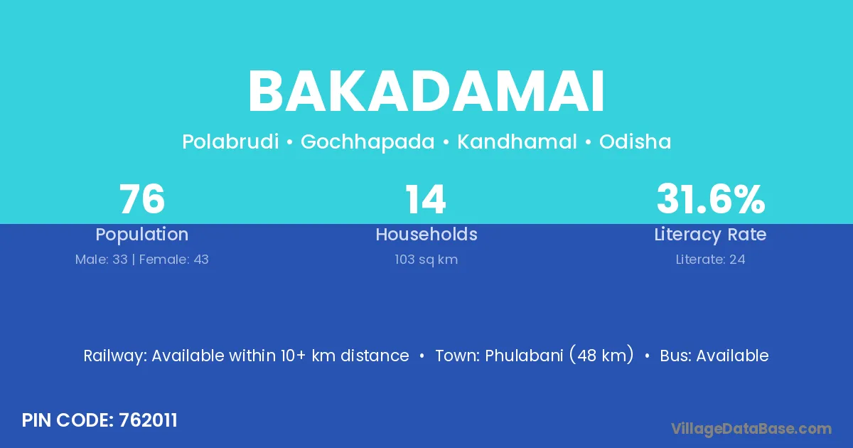Phulabani (48 km) is the nearest town to Bakadamai village for major economic activities and is located approximately 48 km away.