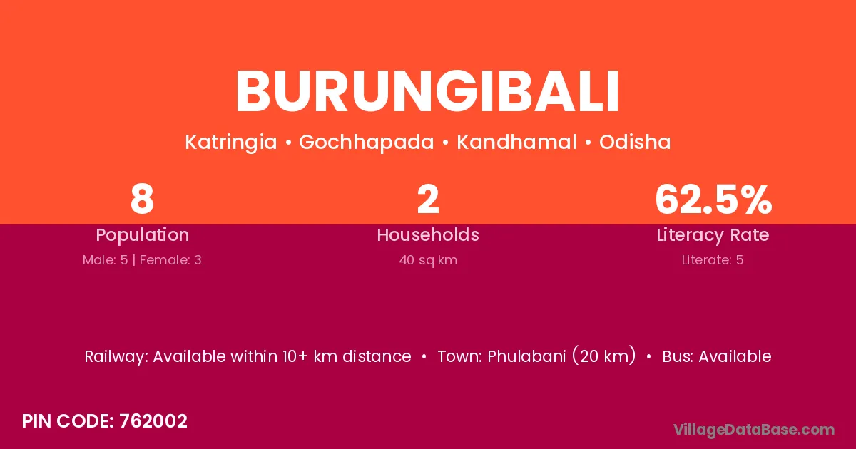 Phulabani (20 km) is the nearest town to Burungibali village for major economic activities and is located approximately 20 km away.