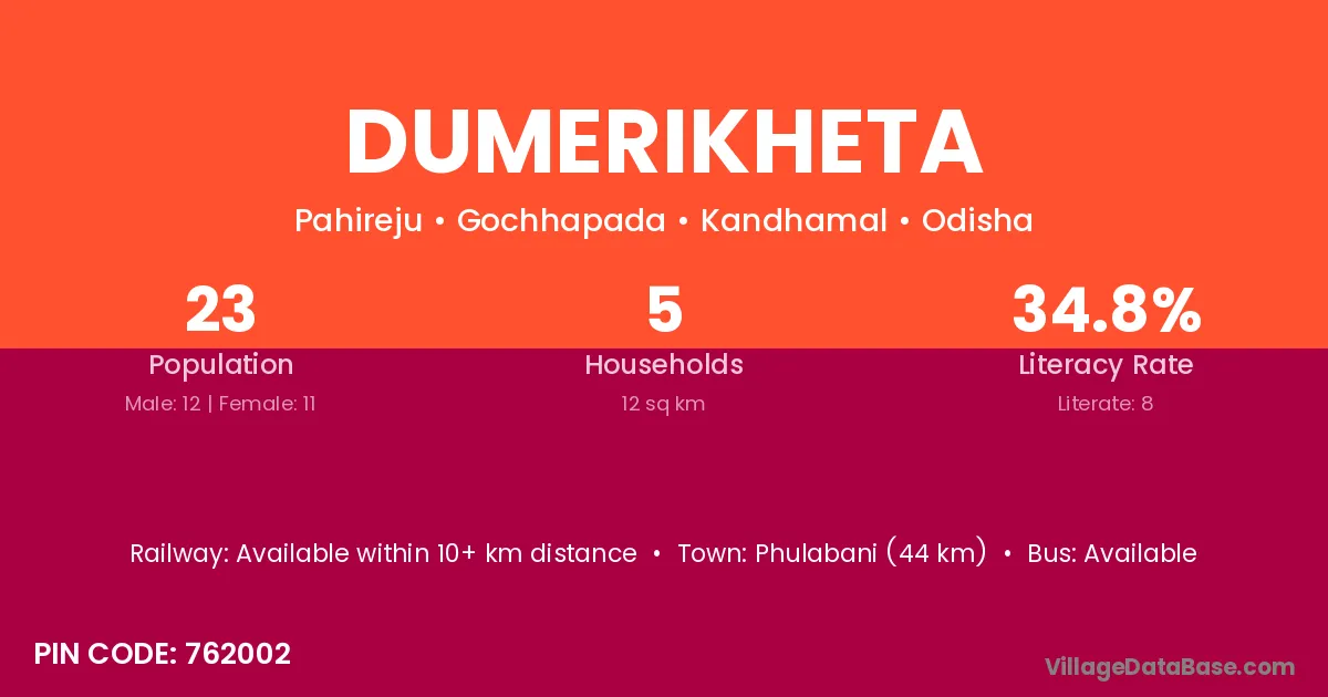 Phulabani (44 km) is the nearest town to Dumerikheta village for major economic activities and is located approximately 44 km away.