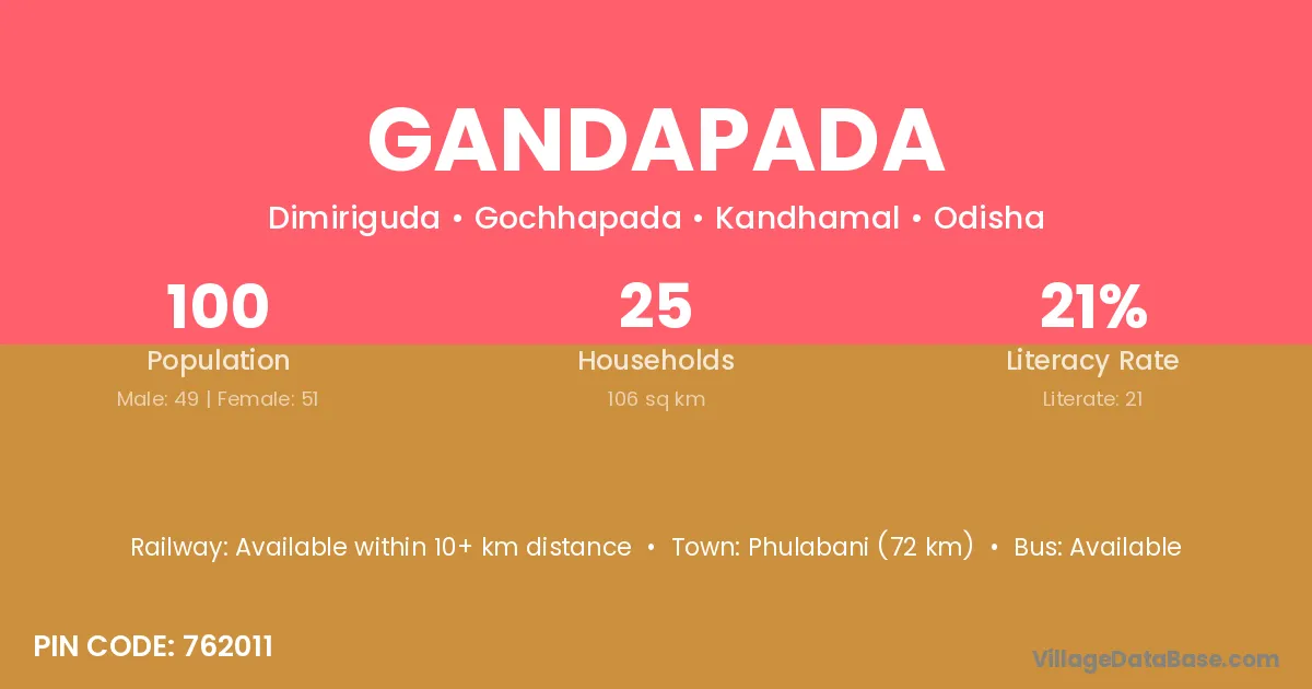 Phulabani (72 km) is the nearest town to Gandapada village for major economic activities and is located approximately 72 km away.