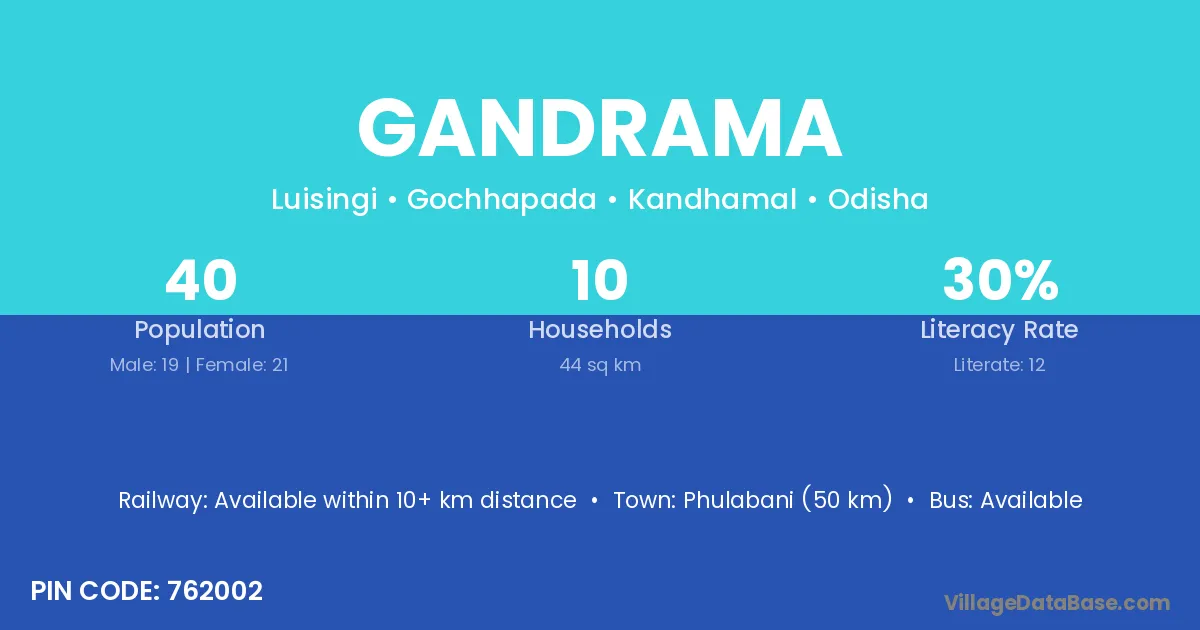 Phulabani (50 km) is the nearest town to Gandrama village for major economic activities and is located approximately 50 km away.