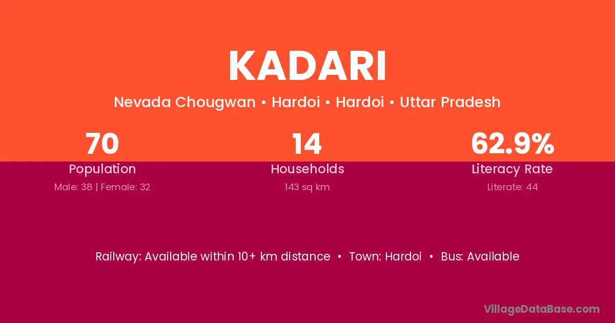 The literacy rate of Kadari village is 22.92%. Male literacy stands at 34.48% and female literacy at 5.26%.