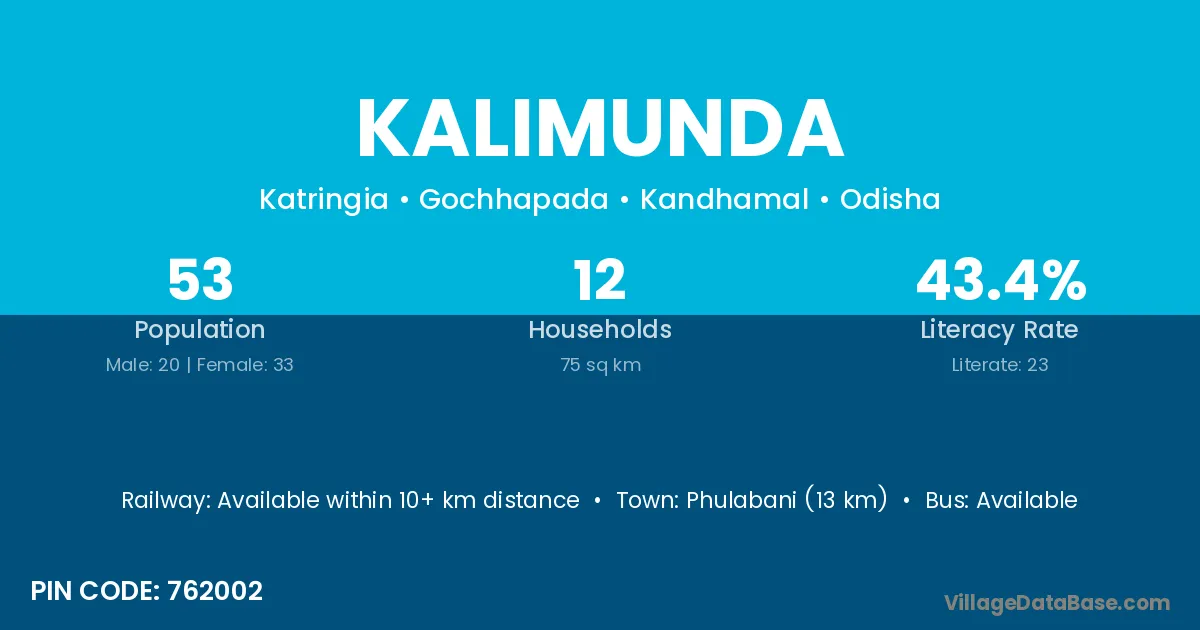 Phulabani (13 km) is the nearest town to Kalimunda village for major economic activities and is located approximately 13 km away.