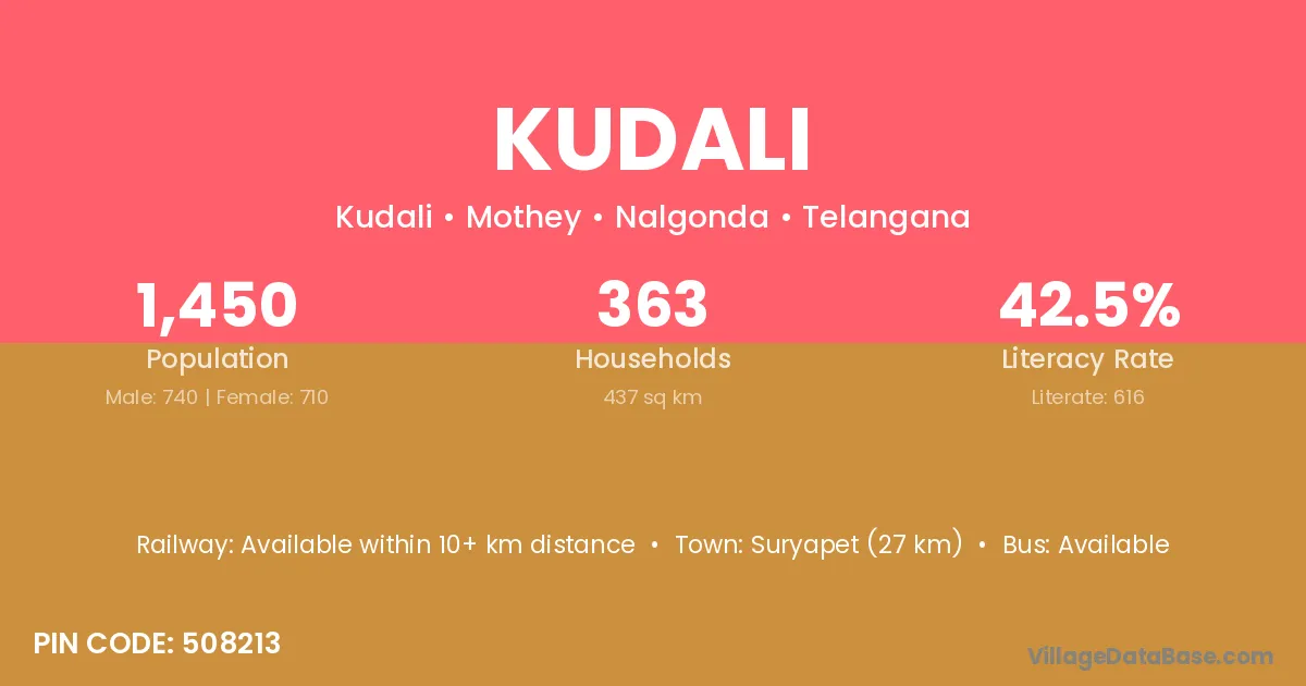The literacy rate of Kudali village is 29.44%. Male literacy stands at 38.10% and female literacy at 21.88%.