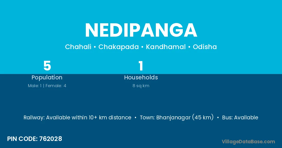 Phulabani (20 km) is the nearest town to Nedipanga village for major economic activities and is located approximately 20 km away.