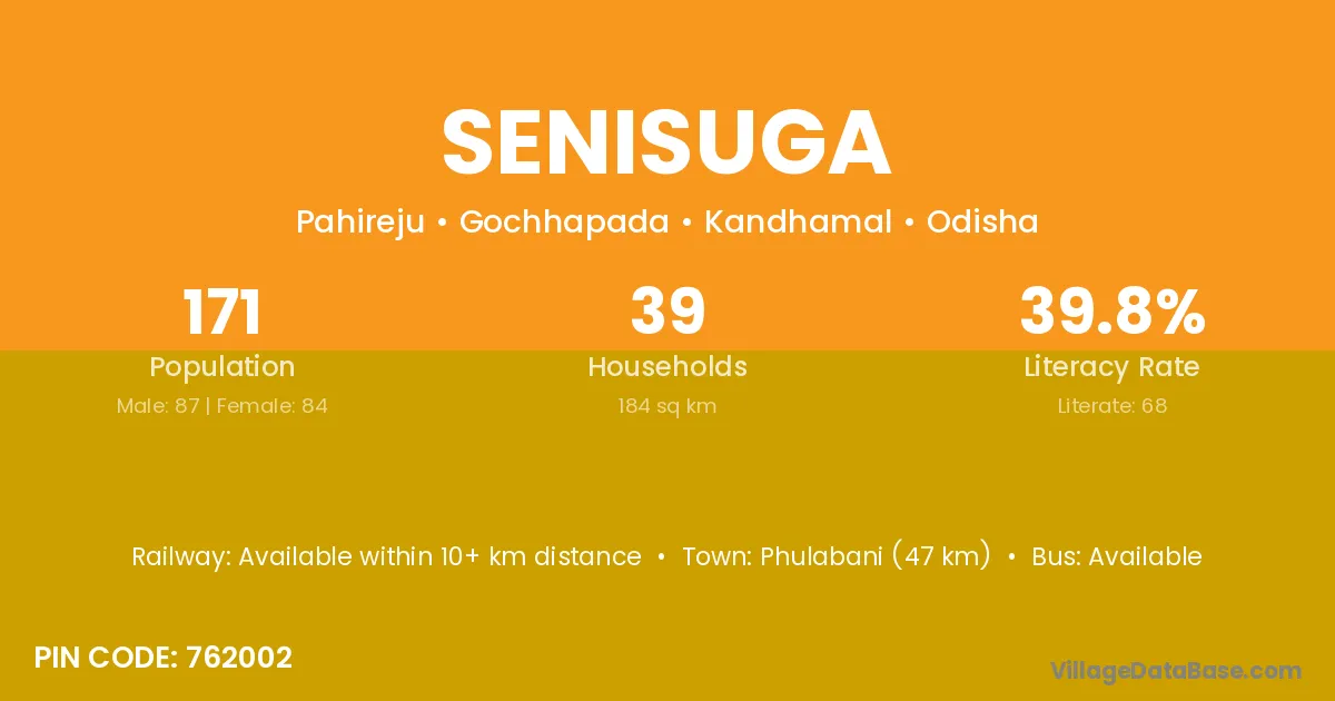 Phulabani (47 km) is the nearest town to Senisuga village for major economic activities and is located approximately 47 km away.