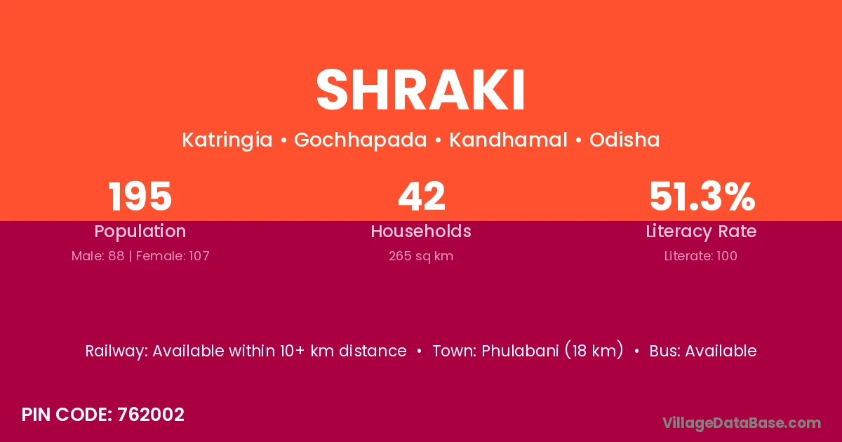 Phulabani (18 km) is the nearest town to Shraki village for major economic activities and is located approximately 18 km away.